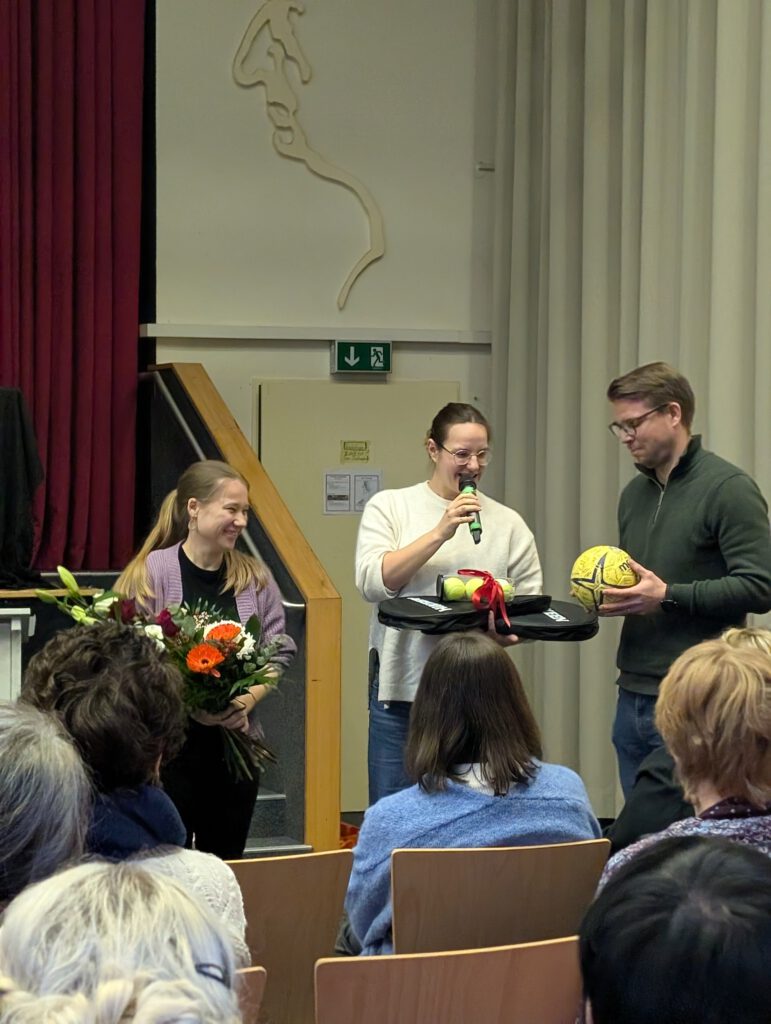Auch das Kollegium ließ es sich nicht nehmen, ein ganz besonders passendes Geschenk zu überreichen: einen Handball, versehen mit den Unterschriften der Kolleginnen und Kollegen – als Symbol für viele gemeinsame Spielzüge, Teamarbeit und Jahre auf Augenhöhe. Ergänzt wurde dieses persönliche Erinnerungsstück durch einen Gutschein sowie die Startausrüstung für sein neues Hobby Padel-Tennis. Damit ist auch für den nächsten sportlichen Anpfiff im Ruhestand bestens gesorgt.