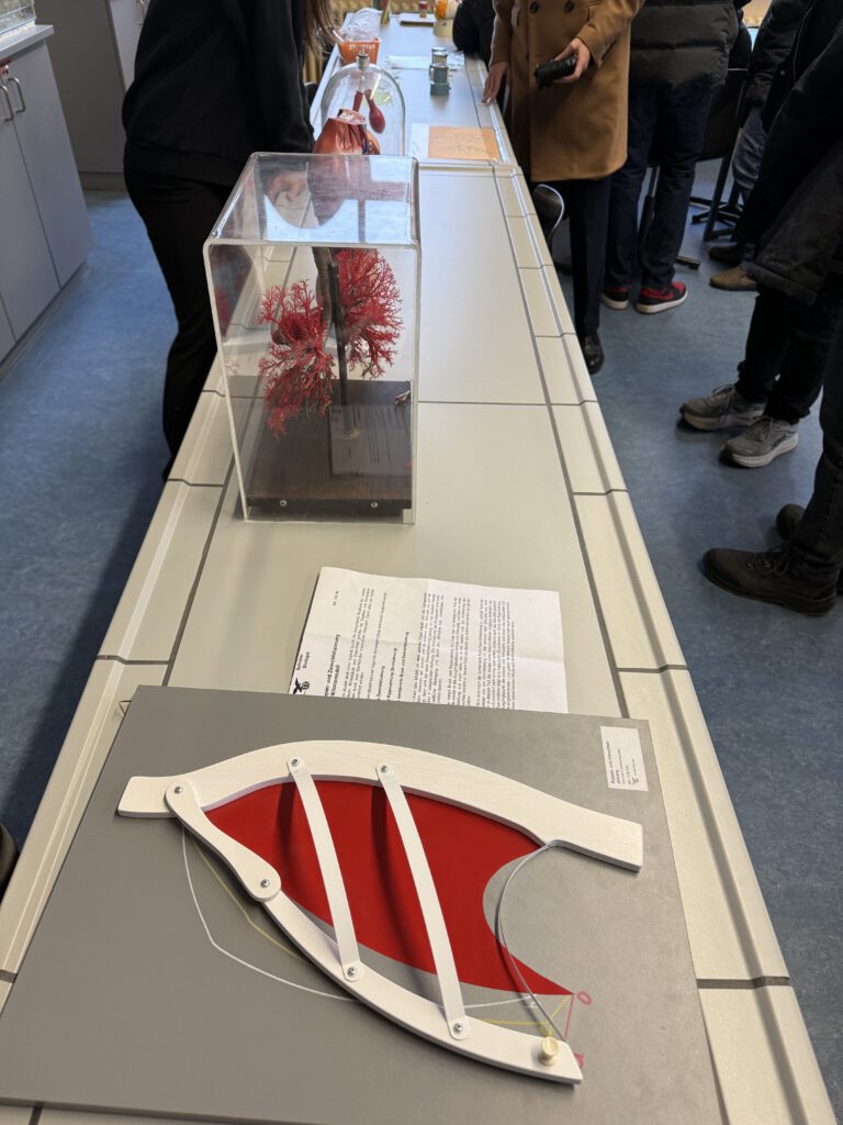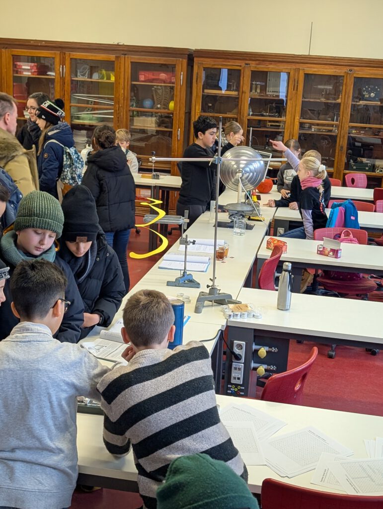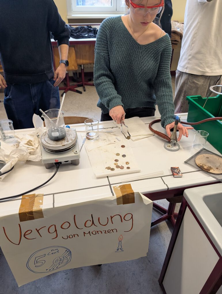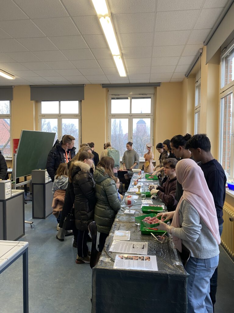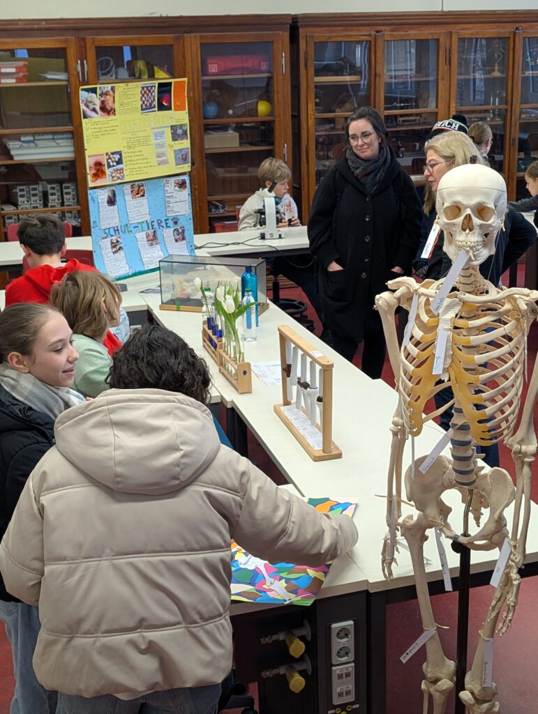 Besonders beliebt waren die zahlreichen Mitmachangebote: In der Chemie durfte man sich (sicher!) die Hand „anzünden“ lassen oder Münzen versilbern, in der Biologie das eigene Lungenvolumen testen und ein Auge sezieren. Die Turnhalle verwandelte sich in einen „Jahrmarkt des Sports“, während im Fachbereich Deutsch Bücher zum Kauf angeboten wurden sowie Rätselgedichte und Märchenkisten warteten. Im Fach Geschichte konnte eine römische Rüstung anprobiert werden, im Fachbereich Englisch lud eine gemütliche Tea-Time zum Verweilen ein. In Ethik und Philosophie ging es auf die Suche nach dem weißen Kaninchen – verbunden mit spannendem Philosophieren mit Kindern. Musikbegeisterte lauschten der Bandprobe, in der Physik begeisterten eindrucksvolle Experimente, und beim Nachhaltigkeitsbeirat konnten Besucher*innen sogar eigene Seife gestalten.