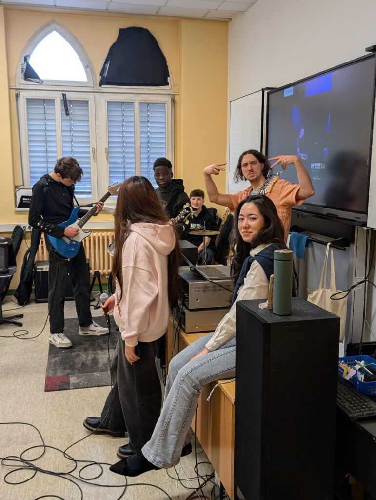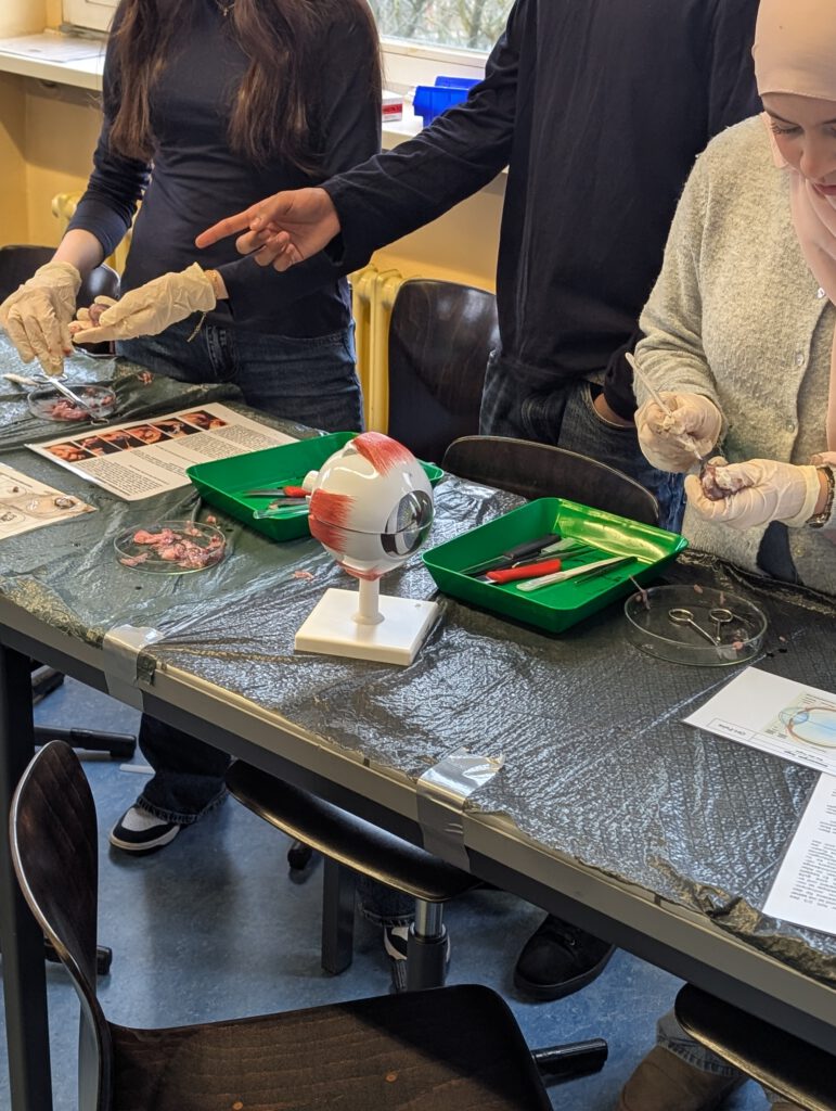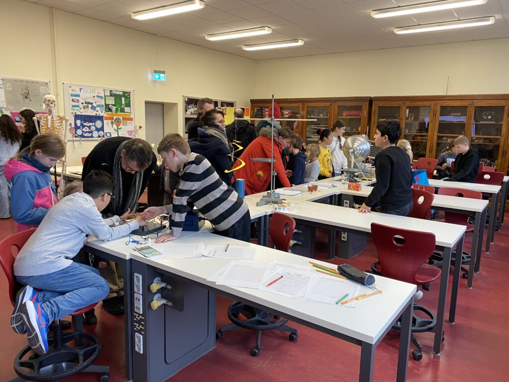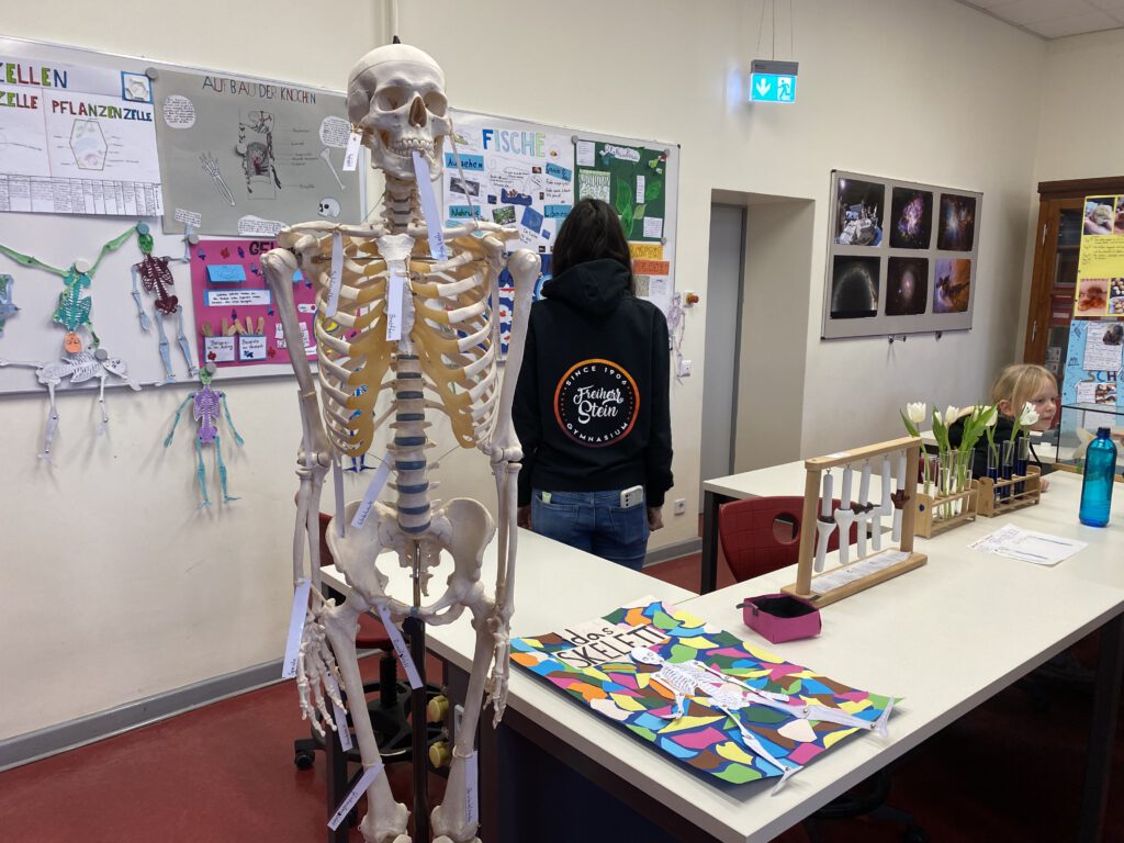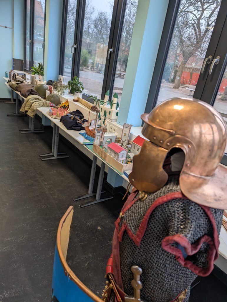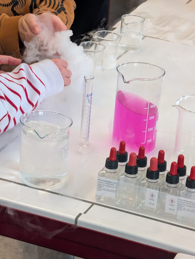 Besonders beliebt waren die zahlreichen Mitmachangebote: In der Chemie durfte man sich (sicher!) die Hand „anzünden“ lassen oder Münzen versilbern, in der Biologie das eigene Lungenvolumen testen und ein Auge sezieren. Die Turnhalle verwandelte sich in einen „Jahrmarkt des Sports“, während im Fachbereich Deutsch Bücher zum Kauf angeboten wurden sowie Rätselgedichte und Märchenkisten warteten. Im Fach Geschichte konnte eine römische Rüstung anprobiert werden, im Fachbereich Englisch lud eine gemütliche Tea-Time zum Verweilen ein. In Ethik und Philosophie ging es auf die Suche nach dem weißen Kaninchen – verbunden mit spannendem Philosophieren mit Kindern. Musikbegeisterte lauschten der Bandprobe, in der Physik begeisterten eindrucksvolle Experimente, und beim Nachhaltigkeitsbeirat konnten Besucher*innen sogar eigene Seife gestalten.